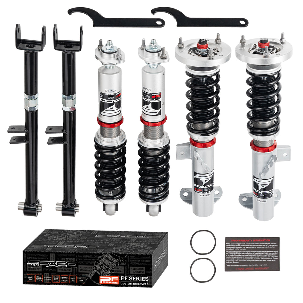 Note: This coilover kit is designed to lower your car by 1¨-1.5" compared to the factory height, even at its maximum setting. Please confirm this suits your needs before purchasing.