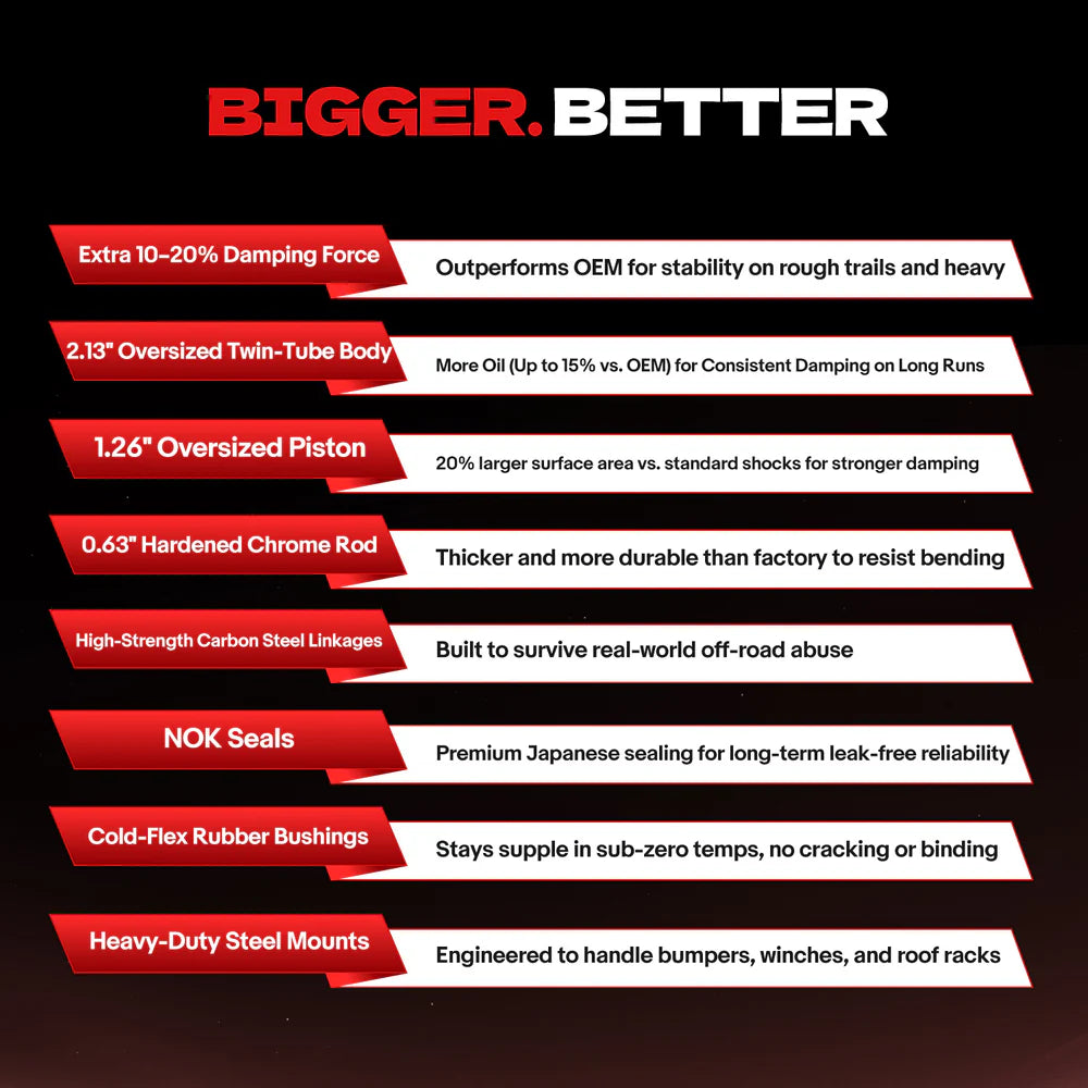 • Engineered for off-road abuse with heavy-duty components that outperform standard factory shocks