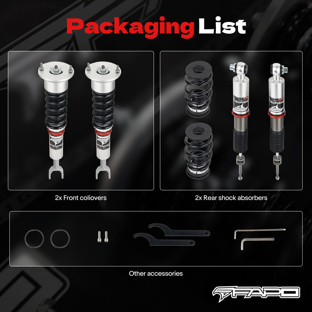 * Note: Our coilover is a lowering kit which will be 1-1.5" lower than factory height even at the maximum setting. Please confirm you want to lower the car before purchasing.