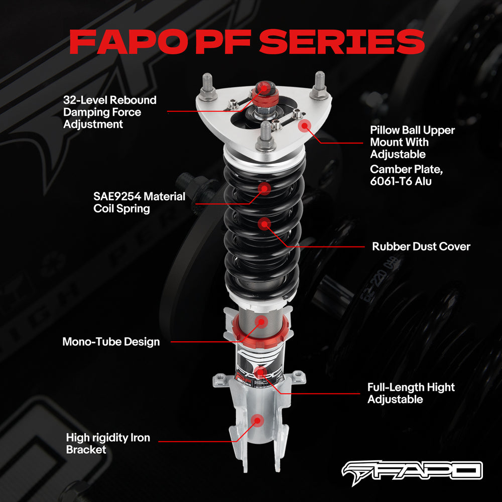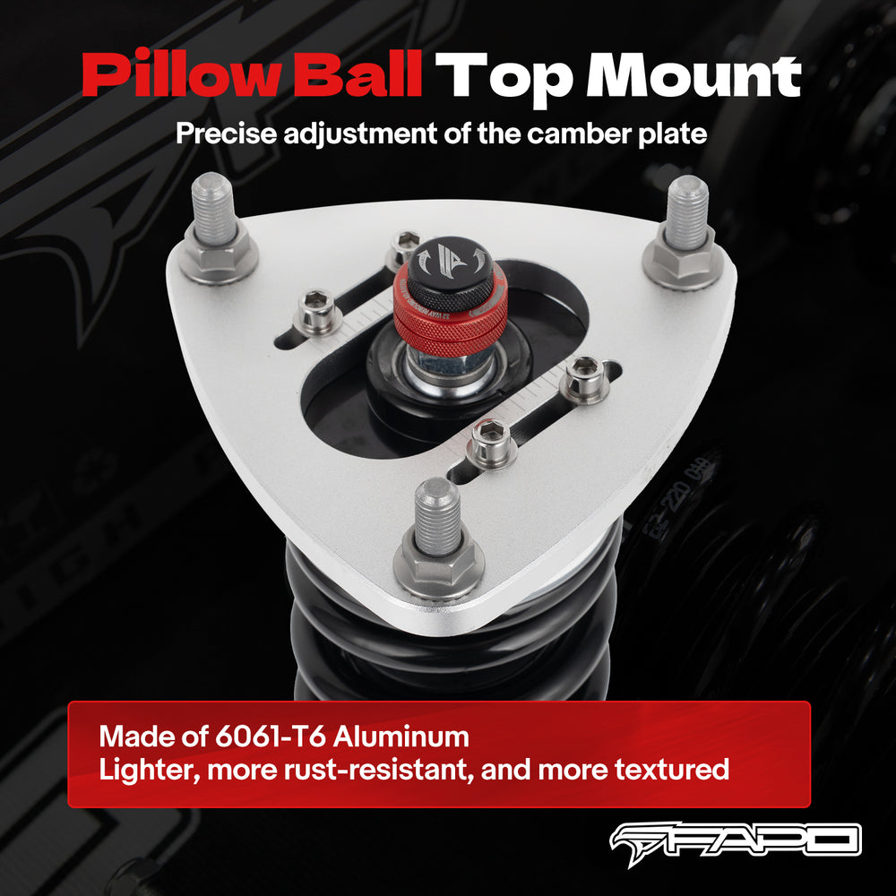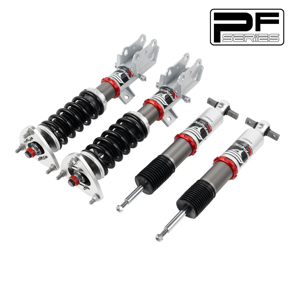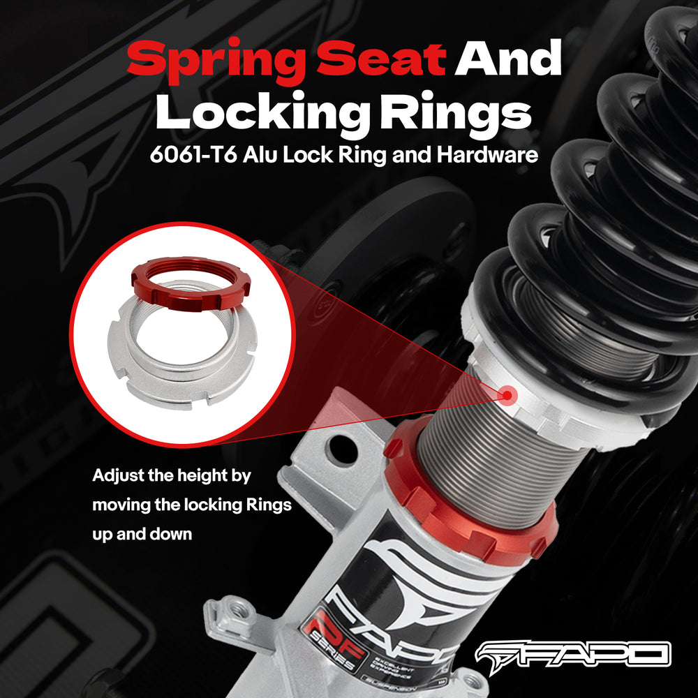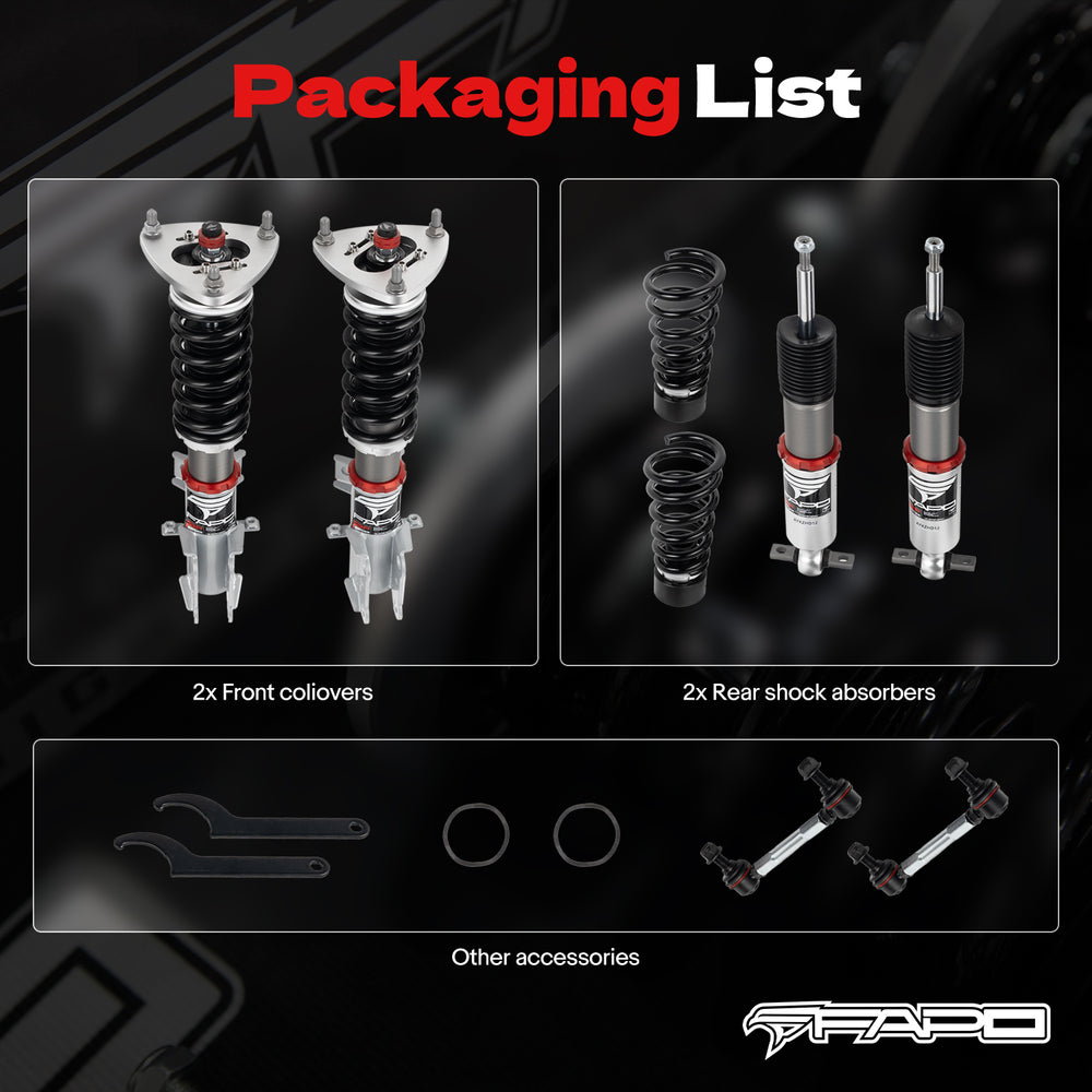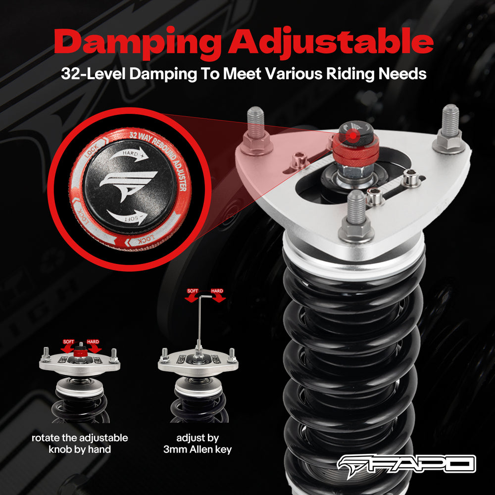 Note: This coilover kit is designed to lower your car by 1-1.5" compared to the factory height, even at its maximum setting. Please confirm this suits your needs before purchasing.