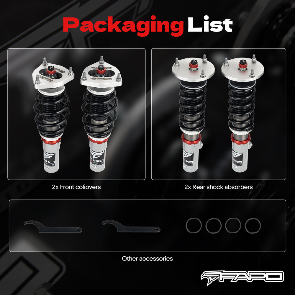 * Note: Our coilover is a lowering kit which will be 1-1.5" lower than factory height even at the maximum setting. Please confirm you want to lower the car before purchasing.